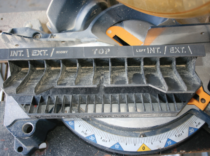 [tip id=”10966″]Si le es difícil visualizar la dirección del inglete, antes de hacer el corte sostenga el trozo de moldura contra la primera pieza y marque el ángulo general en la superficie. Esto asegurará que configure el corte de inglete en la dirección correcta.
