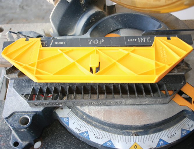 Esta guía especial en particular tiene un placa accesoria para cortar molduras en un ángulo de cornisa de 38/52. Como bono, los extremos angulados lo ayudan a verificar la posición de las molduras conforme las clava.