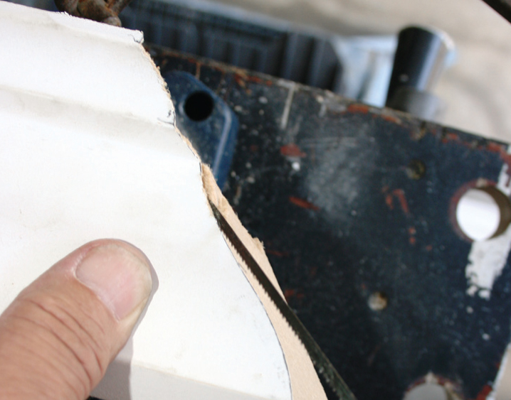 Rebaje con la segueta del extremo del lado derecho de la moldura. Marcar con un lápiz a lo largo del borde proporciona una línea visual sobre la cual cortar. Esto también puede hacerse con una herramienta parecida a una Dremel para retirar material y obtener un buen ajuste.