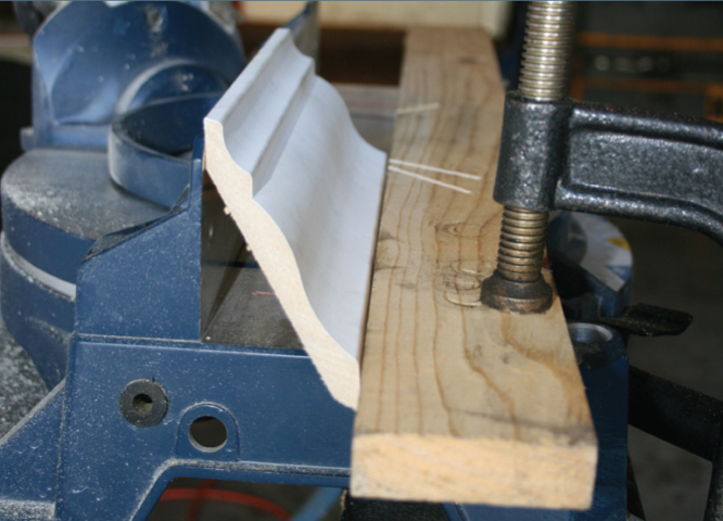 Asegurar una guía con abrazaderas en la mesa de la sierra garantiza que el hombro y el pie (la parte superior e inferior) de la moldura se mantengan en contacto con la guía y la cama y no se tuerza conforme se baja la sierra.