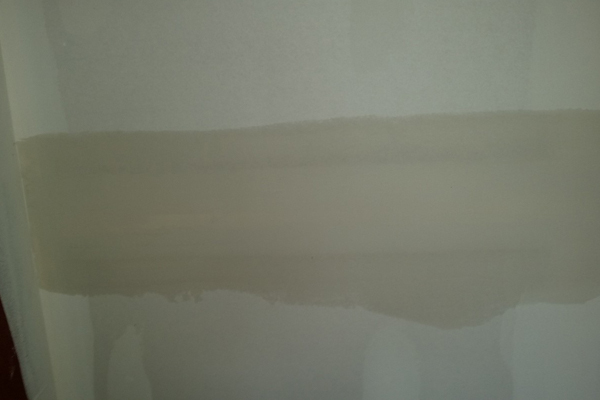 Ahora, tome su mezcla ligera y añada de 2 a 4 onzas de agua y mezcle bien. Si la mezcla está demasiado aguada, será difícil trabajar con ella. Esta capa se puede aplicar con una paleta de 10 pulgadas. Untará la mezcla en las juntas rectas, las juntas planas, las juntas de ángulos y en los bordes de las esquinas.