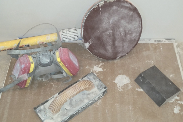 Antes de aplicar la capa de acabado, tome sus herramientas de lijado y lije todas las marcas de traslapo y los puntos altos de la capa anterior. El objetivo es lijar cualquier área que interferirá con la siguiente capa de mezcla.