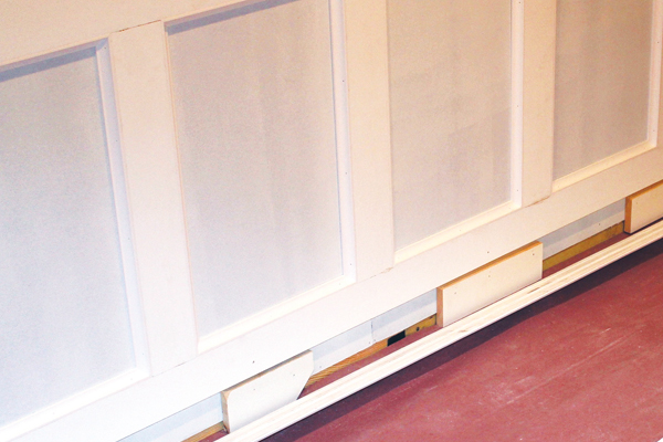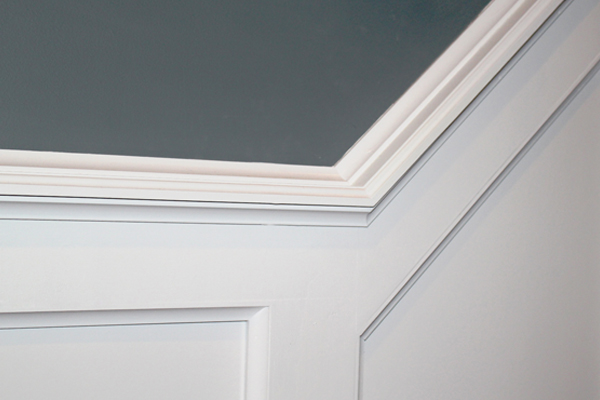 Para instalar recubrimientos de pared en este proyecto, usé tablas de madera prensada de 1⁄8 de pulgada como paneles falsos y material de 3⁄4 de pulgada como rieles y montantes verticales para el marco. Otra buena opción para ambos componentes son los tablones de fibra de densidad media Son mucho menos caros que la madera sólida y son fáciles de perfilar si usa una fresadora en los bordes. Para enmarcar los paneles encastrados, usé bordes decorativos para las esquinas interiores hechos de policloruro de vinilo (PVC). Elegí PVC en vez de madera porque las dimensiones se ajustaban al proyecto mejor que los bordes decorativos interiores de madera que estaban en existencia. Para las guardasillas, opté por pino sólido porque no quería perfilar los bordes. (Muchas veces, perfilar los bordes resulta en uniones longitudinales y/o huecos en el borde fresado).