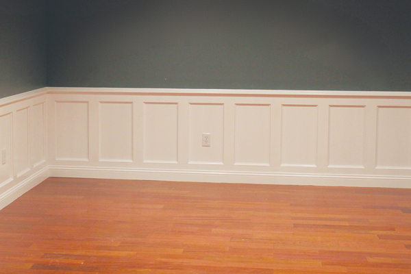 Después de cortar, rebajar y aplicar una capa de imprimador base al material de las guardasillas, asegúrelo a la pared encima del travesaño superior con clavos para acabados. Yo utilicé piezas de borde decorativo por encima y por debajo de las guardasillas, pero ambos son opcionales, dependiendo del diseño que usted haya elegido.