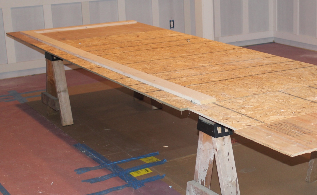 1. Para instalar revestimientos de paneles de madera, comencé estableciendo un área de trabajo dónde crear el espacio suficiente para trabajar. Como había un gran número de agujeros de ocultamiento que taladrar y marcos largos que armar, usé una mesa de trabajo larga sobre los caballetes o bases de trabajo. Puede trabajar en el piso de ser necesario, pero la mesa le permite usar una guía para mantener el material a escuadra (dos tablas unidas con clavos en el ángulo exacto con relación a la otra).
