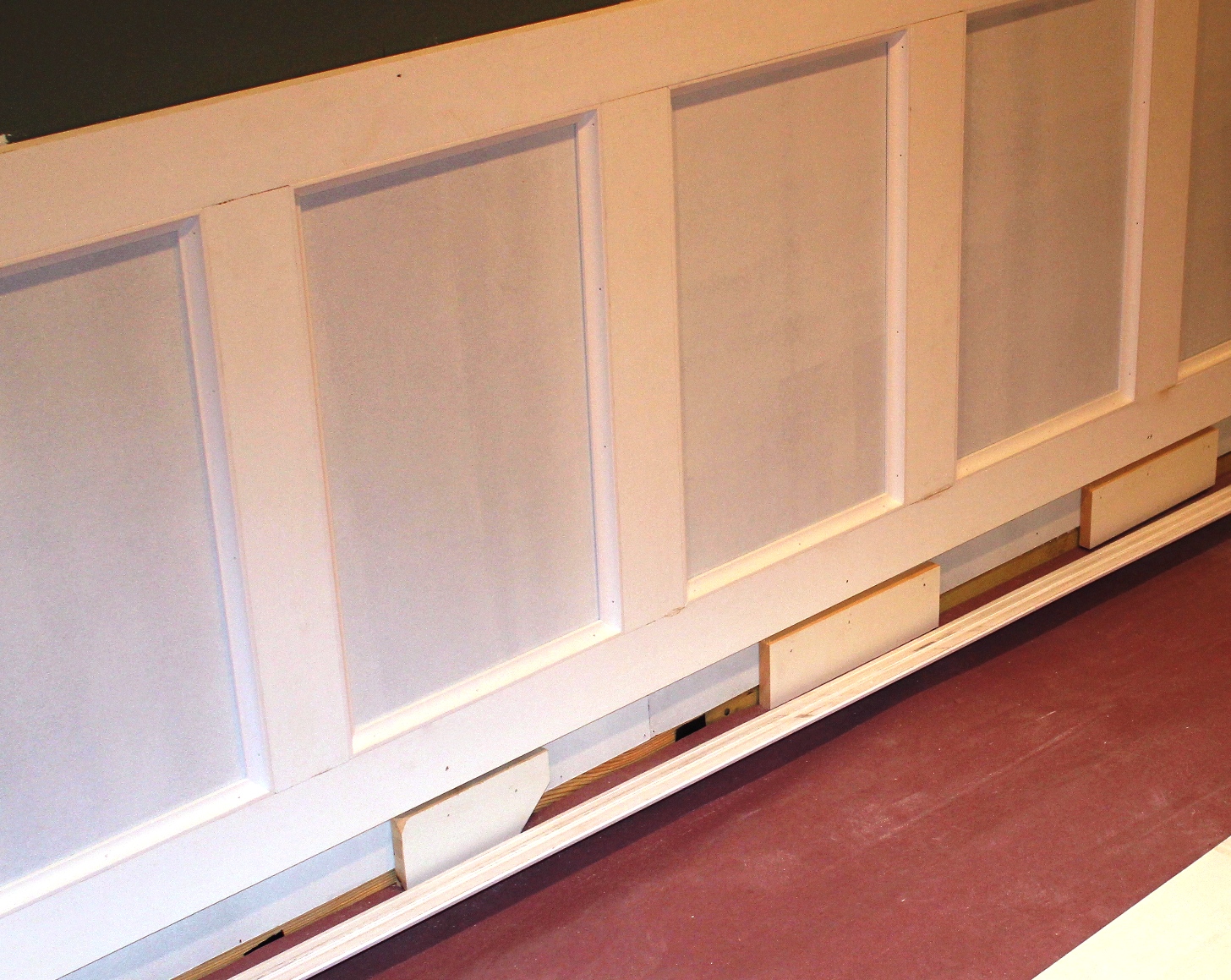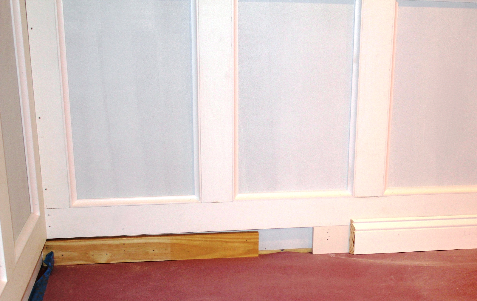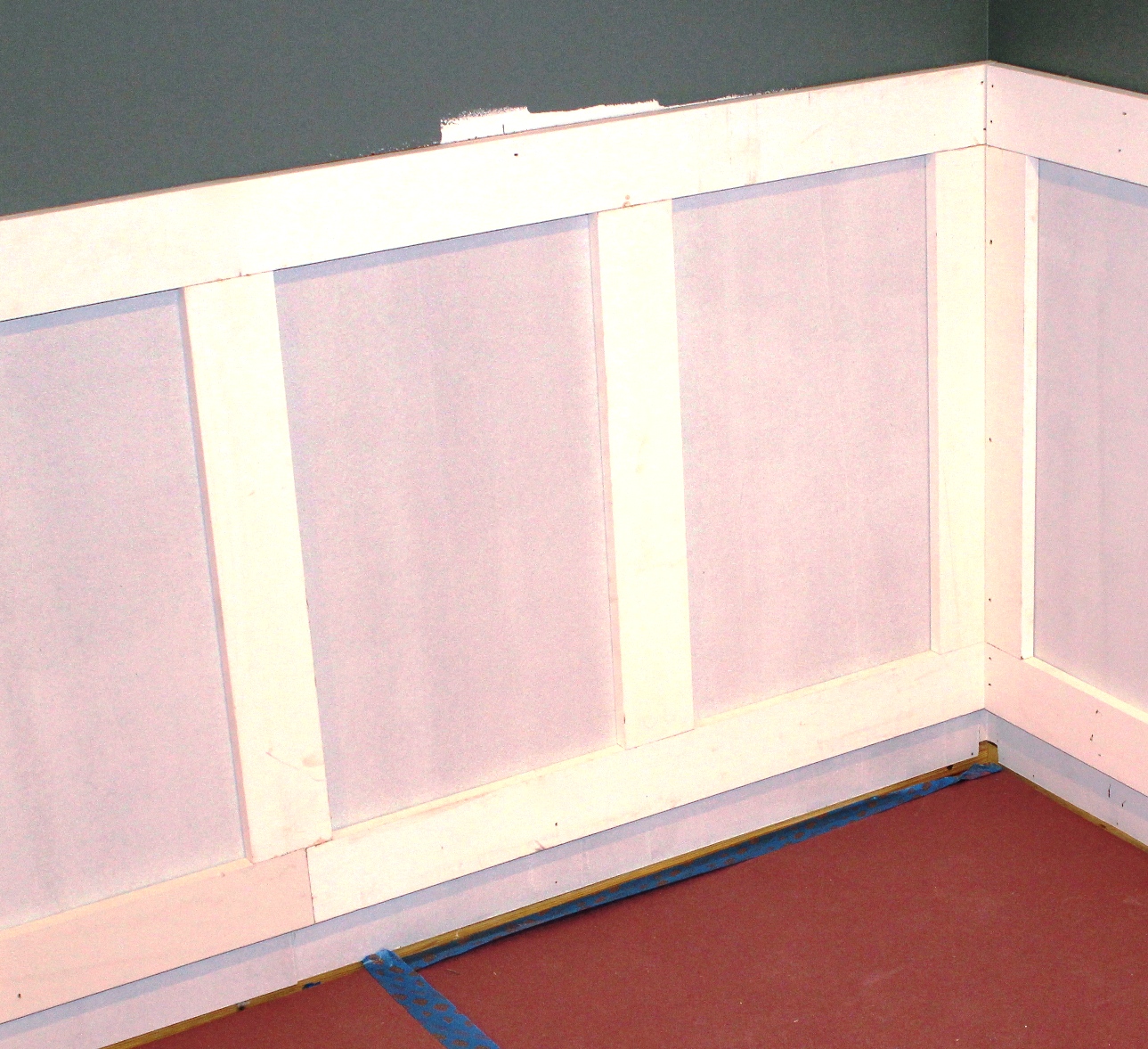 2. Después de aplicar una capa de imprimador base y de cortar la tabla de madera prensada de ⅛ de pulgada al ancho adecuado, clávela a la pared con clavos para acabados de 1½ pulgadas arriba de los bordes del fondo. Asegúrese de que cualquier tipo de uniones queden ocultas debajo de los montantes.