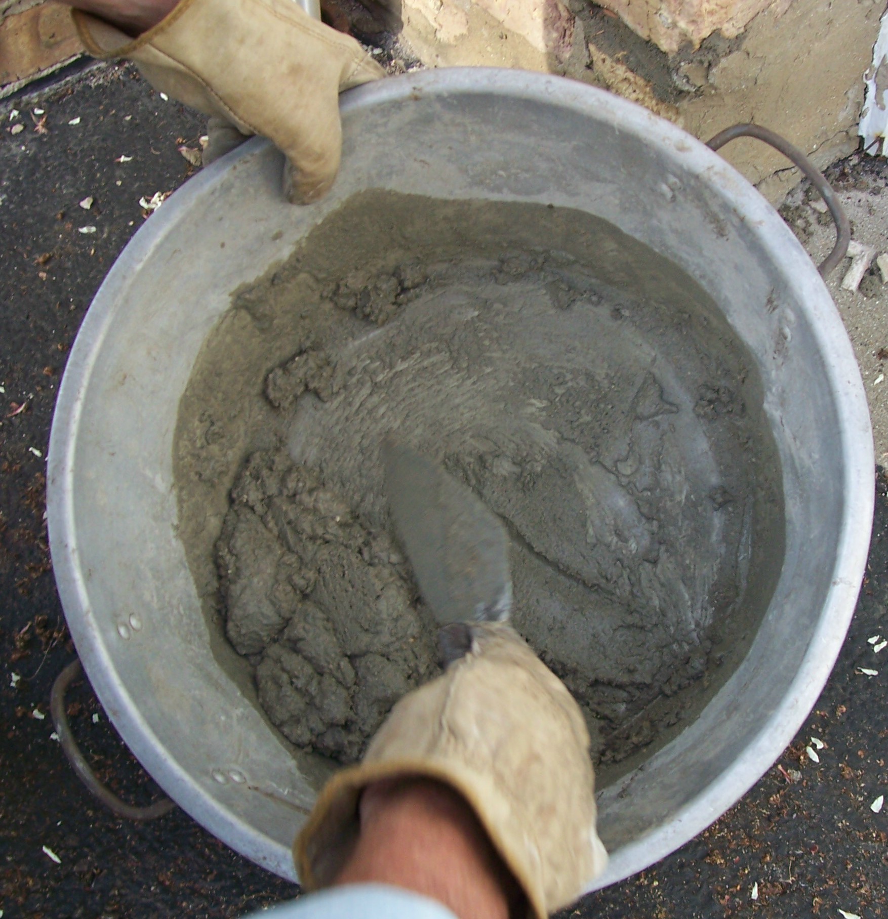 Mezcle el mortero en una cubeta metálica o bandeja poco profunda con una llana de albañil pero en general trate de lograr la consistencia de un licuado de leche espeso, de modo que pueda sacar un pedazo con su llana.