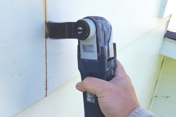 Se usó una multiherramienta oscilatoria para recortar las secciones dañadas de revestimiento exterior.