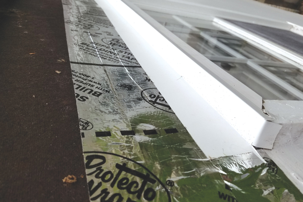 Una vez retirado el revestimiento dañado por el agua, el siguiente paso para reparar los revestimientos de madera fue instalar tapajuntas en las ventanas para evitar daños en el futuro. Esto lo logramos con una combinación de tapajuntas de aluminio que fabricamos en la obra y una cinta para tapajuntas de despegar y adherir. El paso final de este proyecto de reemplazar los revestimeintos de madera fue reemplazar el revestimiento.