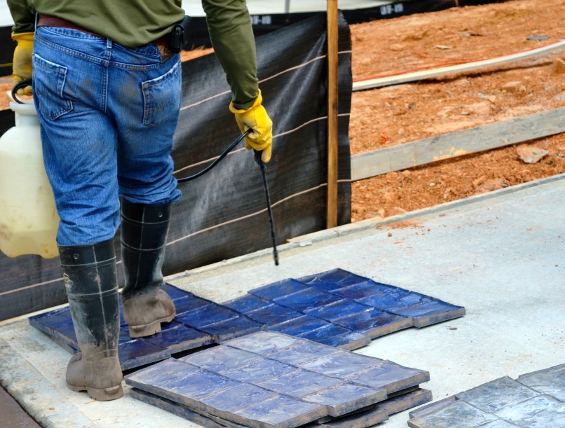 Las estampas deben estar revestidas con el agente desmoldante. El concreto de color con color integral requiere de un rociador líquido, mientras que el concreto entintado con pigmentos en polvo requiere de un agente desmoldante en polvo.