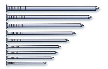 Existen excepciones: los clavos 12d miden 3¼ pulgadas de longitud, los clavos 16d miden 3½ pulgadas de longitud y los clavos 20d miden 4 pulgadas de longitud. A partir de ahí, cada 10d se agrega otra ½ pulgada, por lo tanto, un clavo 50d mide 5½ pulgadas de longitud. El clavo más común para proyectos de exteriores es el clavo común galvanizado 16d.