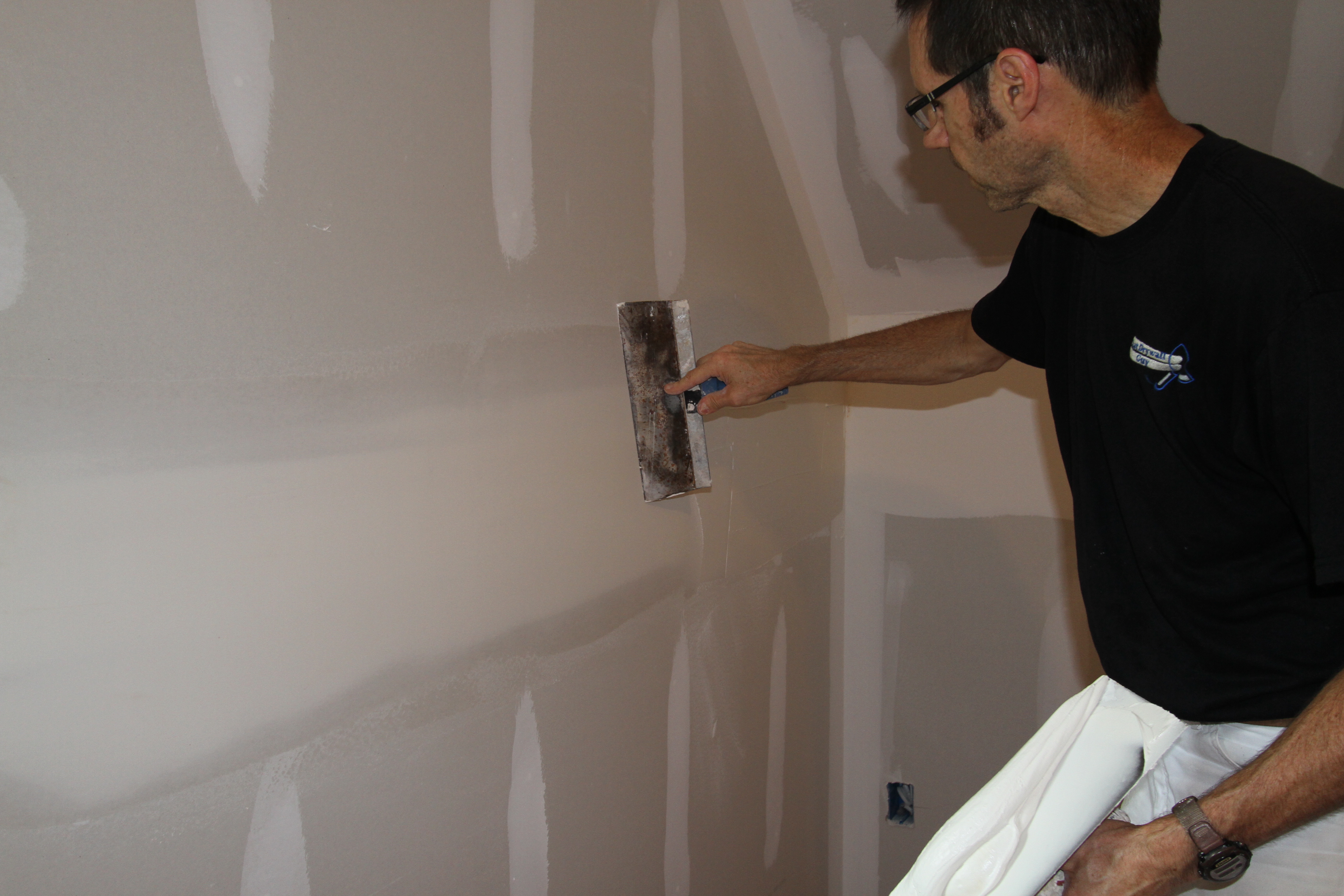 La capa de acabado es una capa delgada de compuesto que, al aplicarse adecuadamente, dejará una superficie muy lisa, con bordes bien esparcidos. Cepillar ayuda a que esto sea más fácil de lograr. Deben quedar muy pocas imperfecciones, excepto, quizás, algunas marcas de espátula alrededor de las intersecciones de unión tras aplicar la capa de acabado.