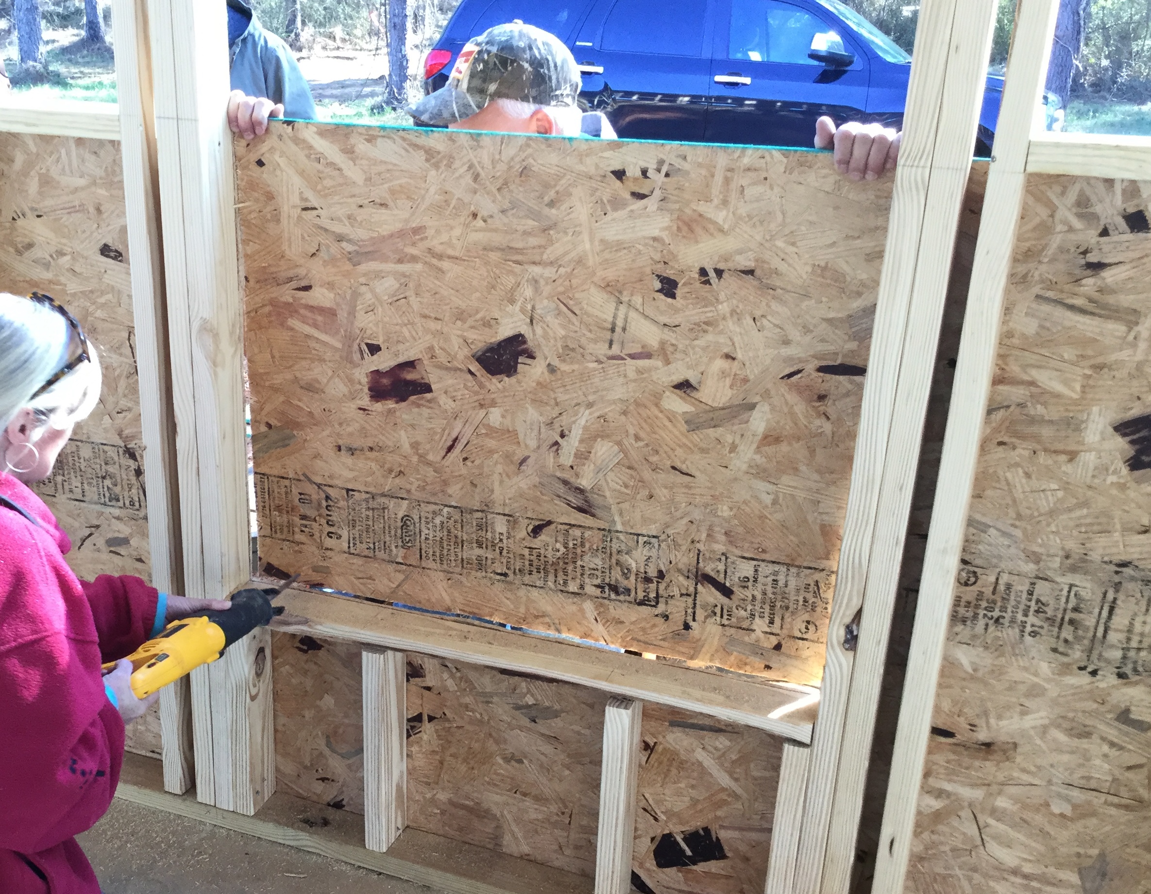 Con el bloqueo instalado, empezamos a instalar horizontalmente los paneles de madera contrachapada. Primero alineamos los paneles de madera contrachapada al ras con la esquina del edificio y comprobamos para asegurar que todo quedara a plomo.