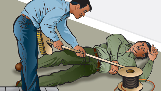 No toque al accidentado hasta separarlo de la fuente de energía.Si el accidentado está aún en contacto con el circuito energizado, desconecte la corriente. Si no puede hacerlo rápidamente, sepárelo del circuito con algo que no transmita electricidad como por ejemplo, un trozo de madera seca.