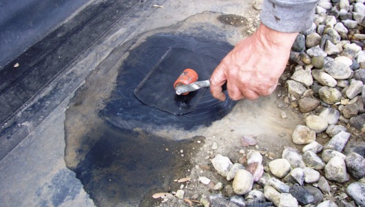 Solución: Muchos techos EPDM están cubiertos con piedras lisas conocidas como balasto. Las piedras mantienen la membrana presionada en su lugar. Si el techo que usted está reparando es de balasto, aparte cuidadosamente las piedras del área que vaya a emparchar. Regularmente, esto se hace para encontrar primero la filtración.